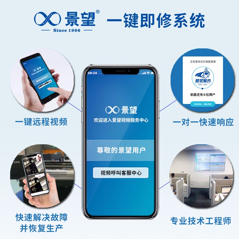 并且还推出景望一键即修,用户可以体验到远程视频修打印机景望远程视频诊断服务应用,随时随刻帮助客户解决生产机器故障,节省客户待机时间,以优质的服务态度帮助客户解决问题,服务我们是用心的!
