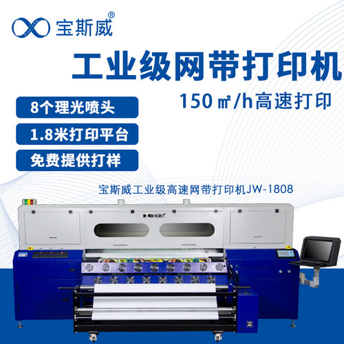工业级网带打印机JW-1808打印皮革地垫产品的优点是打印成本低、即打即干,且耐磨损。机器配置了8个理光工业喷头,可实现150㎡/h的高速生产。另外机器是使用吸风网带平台走料,可以有效防止像压轮式打印机打印皮革时出现皱褶、压痕等情况。
