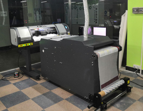 数码柯式烫画打印机其实就是用柯式烫画打印机把图案打印在专用打印膜上,然后通过抖粉机在打印膜的图案背面撒上热熔胶粉,然后放到布料上进行烫压即可。数码柯式烫画对于工艺线条、小字母也能清晰打印,有着免雕刻、免镂空、免排废等优势。