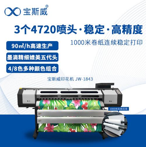 JW-1843K数码印花机:3个爱普生4720喷头,打印速度75㎡/h;