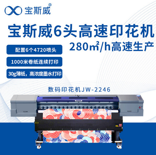 目前宝斯威在售的宽幅的宽幅数码印花机是JW-2246数码印花机。宝斯威JW-2246数码印花机打印幅宽2.2米,配备6个4720喷头,兼具高速与宽幅,更好符合当下客户对设备高标准严要求的需求,对于大幅面的家纺、家装等应用领域,无需拼接,实现一步到位的打印效果,大幅度提升生产效率,助力打造规模化的生产模式。