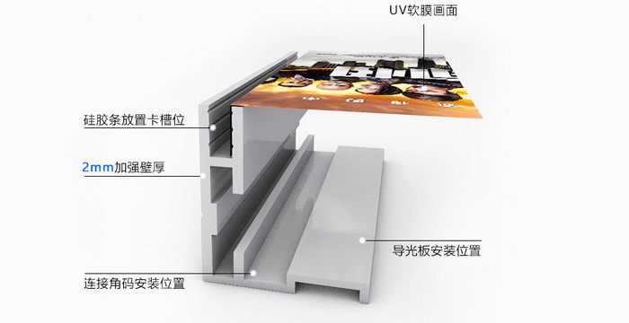 卡布灯箱安装画面时直接将灯箱布四周安装好的胶条嵌入到灯箱外框的凹槽里即可,换画时,将胶条拉出即可换画,拆换更便捷。