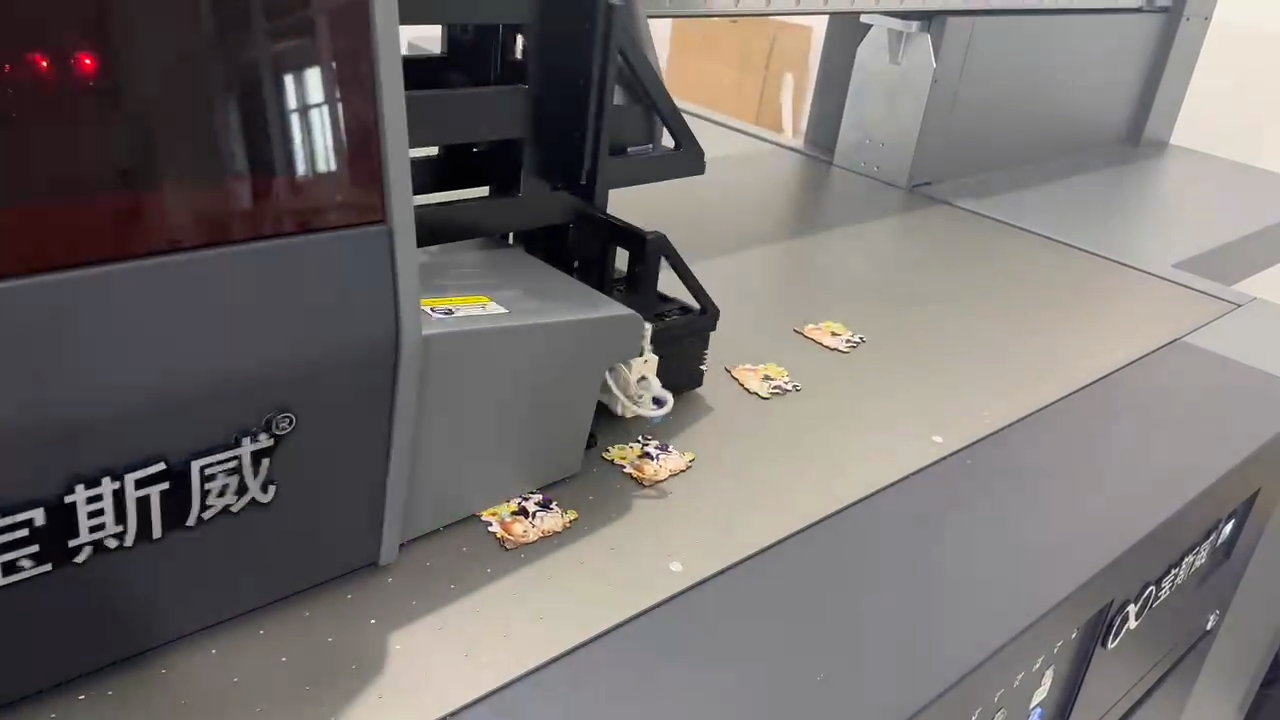 针对此类订单特点,视觉定位技术提供有效解决方案。宝斯威视觉定位UV平板机集成视觉识别系统,搭载磁悬浮驱动与理光工业级喷头,配合专用视觉软件,实现:
